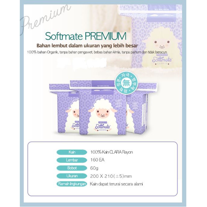 Softmate merupakan tissue yang bisa digunakan baik kering ataupun basah.Tuangkan air mineral (air matang) ke softmate jika ingin menggunakan sebagai tissue basah. Sedangkan untuk tissue kering, softmate mempunyai ketebalan diatas tissue biasa sehingga daya serapnya lebih kuat.Softmate sudah mendapatkan sertifikat eco-friendly dari pemerintah Korea, selain itu softmate juga menggunakan bahan organic dan Clara soft fiber, jadi sangat lembut dan aman untuk bayi newborn sekalipun.Product details:- 100% Rayon Clara Fabric- Bio-Degradable Fabric- 100% Organic- No Preservatives, Chemical Free, Perfume Free, & Toxic Free- Made of natural material, non-irritated- No additives, fluorescent bleach & heavy metals- Hypoallergenic, ideal for newborns and up- Inhibit bacterial growth, safe to use- Made of supreme quality Korean Clara, no fluff left after use- Soft & comfortable, best for cleaning baby's delicate skin- Wide range of uses, can be used wet or dryOrigin: Made in KoreaSize per tissue: 200*210 (+-5)mmCaution: For external use only, if skin irritation occurs, stop using and consult a physician#tissue #tissuebasah #wettissue #premiumtissue #babywipes #makeupremover #natural #organik #hypoallergenic #antibakteri #sensitiveskin #softmate #tissuehalus #tissuel