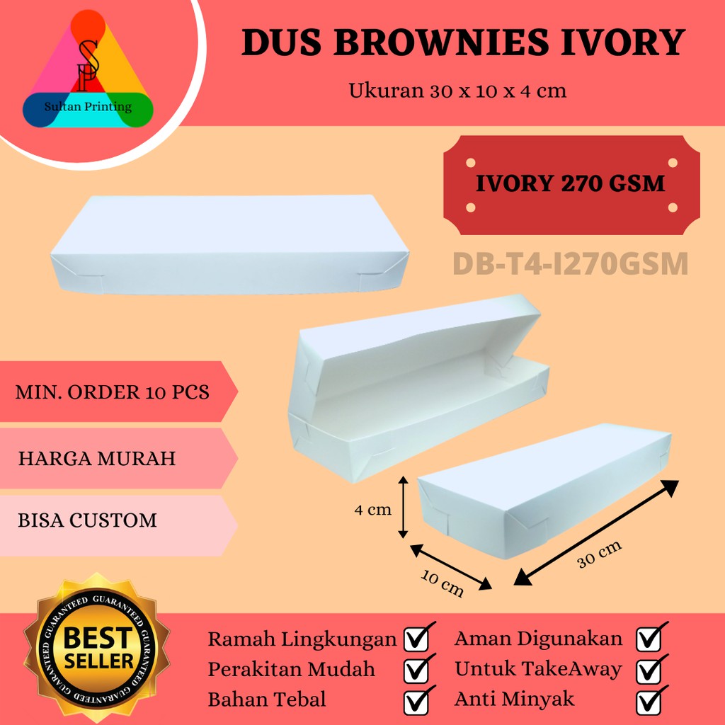 Deskripsi DUS BROWNIES / TEMPAT BROWNIES / KOTAK BROWNIESSpesifikasi :1. Ukuran Dimensi:- Ukuran panjang : 30 cm- Ukuran lebar : 10 cm- Ukuran tinggi : 4 cm2. Bahan:- IVORY 270 GSM (Warna Putih, Lebih Tebal. Tidak terdapat Laminasi)3. Kegunaan:- Brownies- Donat mini- Roti bakar, dll.Minimal Order:1. Bisa Order Minimal 10 PCS2. Disarankan Order 50 pcs dan kelipatannya 50+100+150 dst.Pengiriman:1. Packing menggunakan Bubble Wrap. Barang dipastikan AMAN dari goncangan dan percikan air.2. Barang diterima bentuk FLAT (belum terakit) untuk meminimalisir kerusakan saat pengiriman3. Perakitan/Pemasangan mudah karena terdapat bagian kuncian4. Praktis, tidak menggunakan lem atau steplesCustom Desain/Sesuai Keinginan:1. Minimal Order 20002. Hanya tersedia diluar aplikasi, karena sistem PO.3. Waktu Pengerjaan 12 hari (tergantung dari Desain)4. Untuk harga dan Info lanjut silakan htanyakan Admin via Chat.Dengan menggunakan bahan dasar kertas, kita sama-sama mengurangi penggunaan plastik dan sterofom yang butuh waktu lama untuk terurai. #SaveEa
