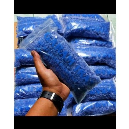 berat sekitar 500 gram / packblue saltDiformulasikan untuk digunakan pada masa karantina, baik untuk menekan stress, selama dalam transportasi ataupun perawatan harian. Dapat membersihkan ikan/ membuat ikan tetap cerah dengan cara melindungi ikan/ membuat lapisan biofilm pada tubuh ikan dan dapat menjernihkan air dengan cara mengikat kotoran, sehingga tidak kontak langsung dengan ikan, berfungsi sebagai antifungus/ jamur, mencegah penyebaran jamur, pengobatan terhadap penyakit kulit (White Spoot/ Bintik putih), menjaga telur dan burayak dari serangan jamur dan yang terpenting tidak berbahaya bagi tanaman ataupun bakteri filter yang telah terbentuk (bersifat bakteriostatik).Garam ikan biru berupa kristal ini tlh lama dikenal para akuaris.Garam ikan berbeda dengan garam dapur, karena garam ini masih murni alami tanpa tambahan bahan apapun, bila garam dapur dikhawatirkan dapat mempunyai dampak negatif pada ikan.Fungsi :- Membunuh / mencegah / mengobati parasit, jamur / penyakit ikan- Meningkatkan PH- Mengatasi white spot / ich / kembung- Mencegah & mengatasi stress / keadaan terlukaDOSIS :Sebagai profilatik / tonik / jamu :1-2 sendok teh per 4 liter air / 1-2gr per liter / 0.1-0.2%Infeksi Jamur / Bakteri :1% atau larutan 10gram garam serta 1ltr air dosis bertahap selama 24-48jamMelepaskan lintah :Rendam dalam waktu singkat dalam larutan 0.25%Obat Infeksi (Velvet):10gr per 45 liter air atau 1 sendok teh per 4 liter airPerhitungan :Misal aquarium > 100x50x50cmtinggi air 40cmMaka volume air > 100x50x40cm = 2000000cm3 = 200liter = 200kgBila dosis 0.1%, maka 200kg x 0.1% = 0.2kg atau