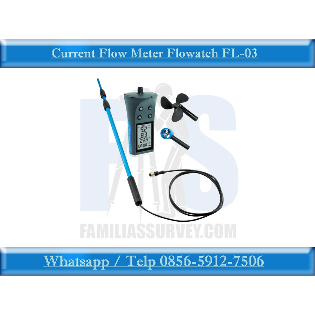 Fitur dan Spesifikasi Current Flow Meter Flowatch FL-03Mengukur arus sungai.Irigasi kanal.Arus Lautconduits penyejuk udaraLayanan aliran air limbahVentilasi PorosHidrologiAerologicalCerobong flues.Kecepatan aliran Pengukuran:Satuan: km / jam, mph, knot, m / s dan cm / sAkurasi: + / – 5% dari -10 hingga + 50 C.Rentang Pengukuran: 2 hingga 150 km H /SuhuUnit: ‘F dan WindchillAkurasi: + / – 1 ‘Fungsi: Lancar, minimum, angsuran, suhu maksimum yang diberikan faktor Windchill.Paket Pembelian :Flowatch FL-03 Current Meter / Flow MeterAluminium Carrying caseTelescopic aluminium probe. Temperature sensor at the probes extremity. Probes Length: 1.2mAir impeller 20 mm, hole diameter 33 mmWater impeller 60 mmHanging velocity water current sensor with a 15 meters cable, water impeller incor