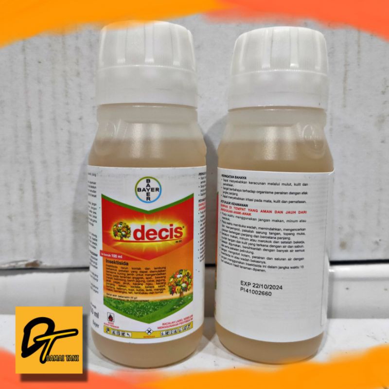 DECIS 25EC KEMASAN 100 MLDecis 25EC adalah Insektisida racun kontak dan lambung berbentuk pekatan yang dapat diemulsikan berwarna kuning jernih untuk mengendalikan hama pada tanaman anggrek, apel, bawang merah, belimbing, cabai, jagung, jarak pagar, jeruk, kacang hijau, kacang panjang, kakao, kapas, kedelai, kelapa sawit, kentang, ketimun, kopi, kubis, lada, mangga, melon, semangka, teh dan tomatKeunggulanPilihan para pekebun untuk mengendalikan ulat apiDecis memiliki knock-down yang sangat baik, dimana hama yang terkena dalam hitungan menit akan jatuh, kemudian matiMemiliki efek anti feeding. Hama berhenti makan sehingga walaupun hama belum mati tetapi menimbulkan kerusakan lagiMempunyai efek repellent, sehingga hama akan menghindari tanaman yang sudah diaplikasiDosis aplikasi yang sangat rendah dibandingkan dengan produk lainBahan aktif : Deltametrin 25 g/lCara Penggunaan :Campurkan 2 - 10 ML Cairan Decis pada 1 Liter air. Lalu semprotkan pada tanaman yang terserang