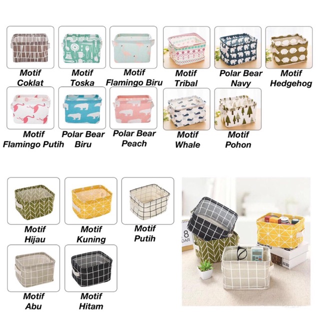 | KERANJANG LIPAT SERBAGUNA - STORAGE BOX - TEMPAT PENYIMPANAN SERBAGUNAKeranjang terbuat dari yang berkualitas tinggi(kain katun linen) anti air.Mudah dibawa kemana-mana karena dapat dilipat, cocok digunakan utk berbagai keperluan Anda.Ukuran 20cmx16cmx14cmTersedia banyak vari